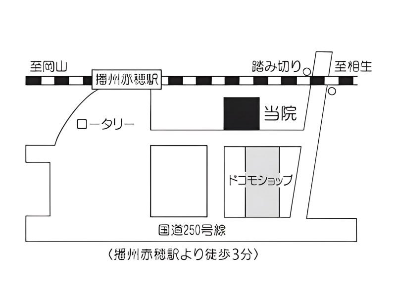 兵庫県赤穂市加里屋30-9電話番号 0791-43-5357 FAX 0791-45-1566 診療時間 9:00~12:30 / 16:00~18:30 休診日 水曜午後、土曜午後、日曜・祝日 -